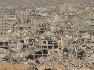 'Patchwork of dust and misery': At the Yellow Line dividing Gaza - where all that remains are skeletons of buildingsIn front of me, there is a building that has collapsed upon itself, six floors piled upon each other.