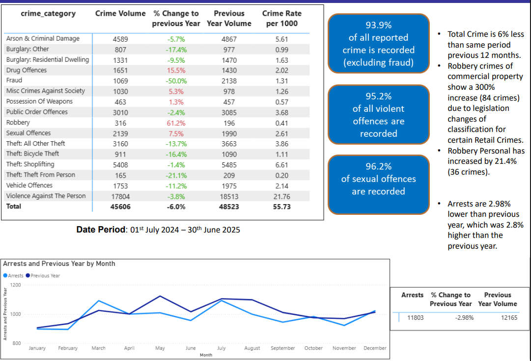 " A good reduction in crime last year that we saw, which was very pleasing. That's the second year in a row we've seen a reduction in crime and we're on again this year to reduce it further. There's some healthy reductions in there. Bike theft, which tends to affect us. Robbery, in particular, at 61% above where we were last year, is problematic.
