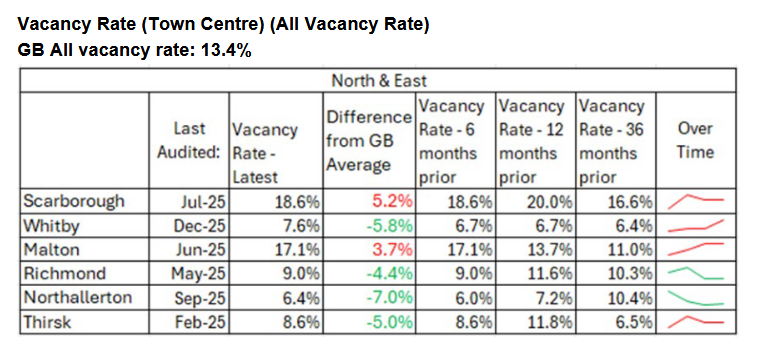 The town centre vacancy rate in Scarborough is almost two and a half times that of Whitby and York.