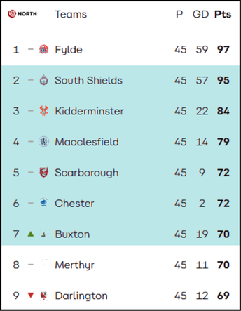 In the National League North, teams finishing second through to seventh qualify for the promotion play-offs. The mathematics for Scarborough are simple: a win against Bedford Town guarantees a play-off spot. A victory would see them finish on 75 points, which is entirely out of reach for eighth-placed Merthyr Town, who have 70 points, and ninth-placed Darlington, who sit on 69 points.