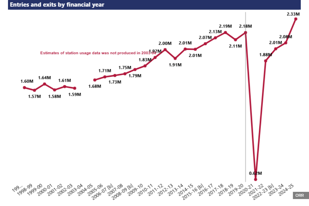 The Office of Rail and Road notes that these statistics are estimates based on ticket sales, derived primarily from the rail industry’s ticketing system (LENNON), and that usage estimates are not always directly comparable over time due to continuous methodology improvements.
