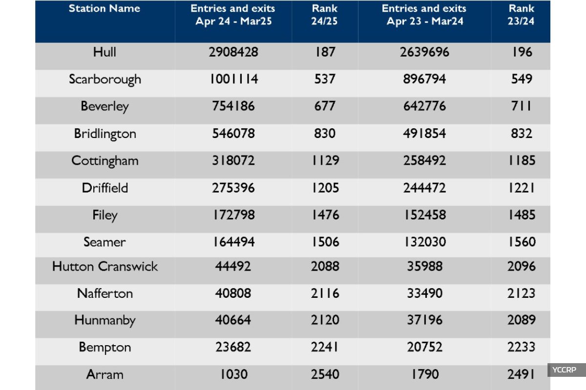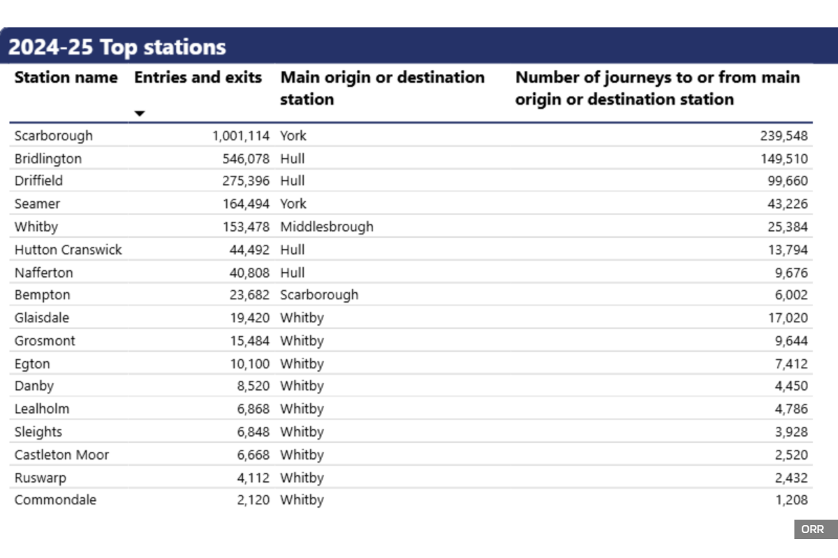 New figures released by the Office of Rail and Road (ORR) show that passenger usage across the Yorkshire Coast railway network has continued its strong recovery, reaching a total of 2.33 million entries and exits during the financial year spanning April 2024 to March 2025