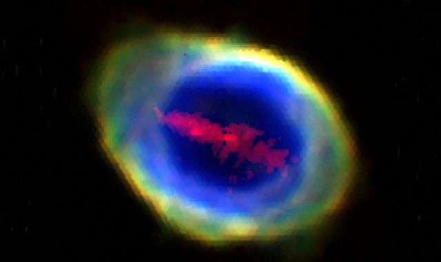 It appears in the Ring nebula, also called Messier 57, which consists of the glowing remains of what was once a sun-like star in the constellation Lyra.